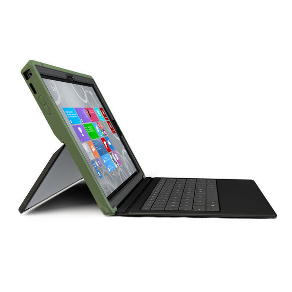 DropTech's impact resistant outer silicone layer and structural inner frame provides a rugged long term solution with dual-layer protection. The Surface Pro 3's kickstand and keyboard are integrated and fully functional.